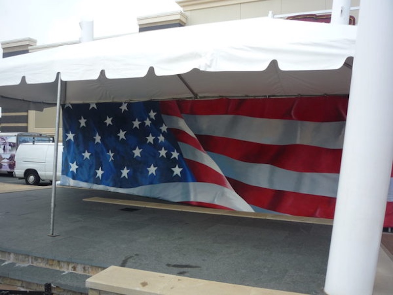 Huge hand painted backdrop on durable canvas with hanging grommets. (Lettering as seen in the one photo is not present on the banner.)