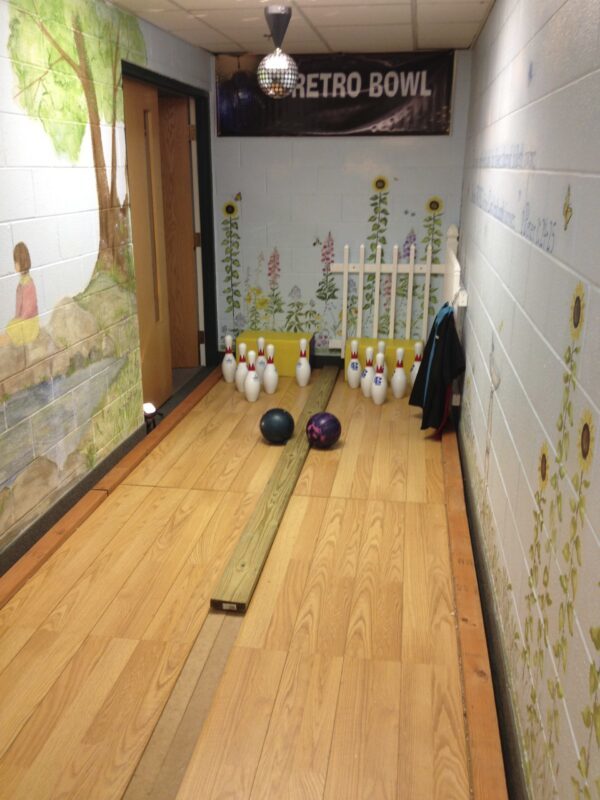 Two lane bowling. Includes two sets of pins, two balls, two lanes, and the retro decor (banner and disco ball) if desired. We also have to disco era retro bowling outfits that can be rented for an additional charge for your game operator volunteers to wear!