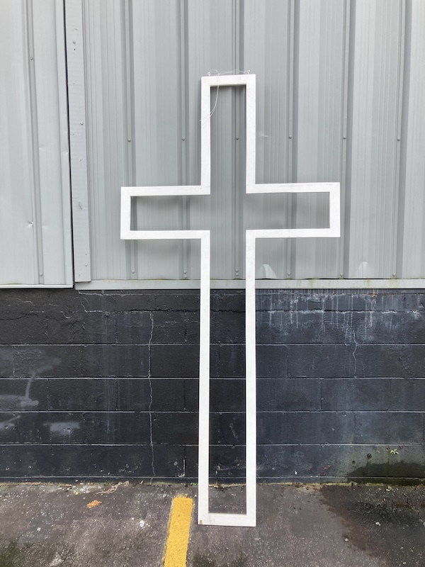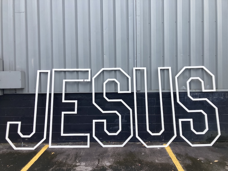 Large wooden cutout letters that spell JESUS and a cross. Two different letter styles. Great for use in a church Easter stage display.